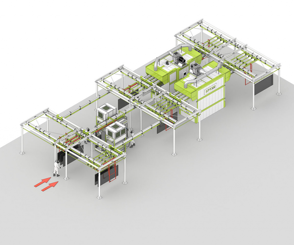 Комплекс оборудования для окраски и сушки изделий с подвесным конвейером SPK-30.12.4. состоит из:- Подвесной транспортной системы (плоско-параллельный конвейер с ручным перемещением; завеска на траверсу и снятие изделий производится вручную операторами либо с помощью кран-балки Заказчика; распределенная нагрузка на одну траверсу — до 300 кг